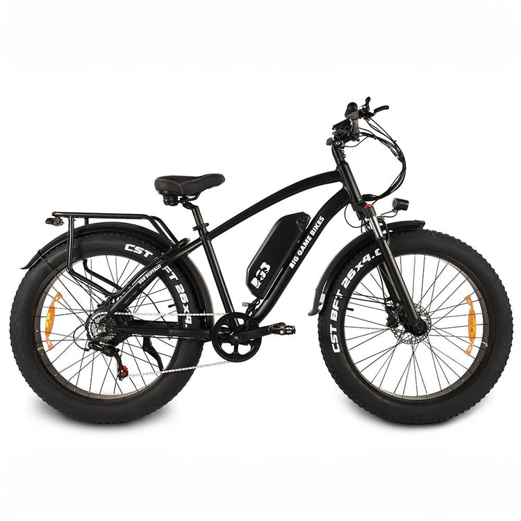 Crafted with durability in mind, the Buffalo 750w Mountain eBike features an aluminum frame, hydraulic brakes with 160mm rotors, and a suspension fork that absorbs shocks and bumps with ease. The Shimano 7-speed gear system provides smooth shifting, and the 26 x 4-inch tires offer stability and traction on any surface. With front and rear mudguards included, your ride stays clean and controlled through mud and grime.