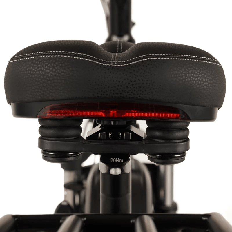 Ride in comfort with the ultra-comfort, adjustable spring-loaded saddle and ergonomic rubber grips that reduce fatigue on longer rides. The integrated LED front light and rear taillight with brake signals enhance visibility and safety during low-light conditions. The rear rack supports up to 30kg, perfect for carrying gear on your off-road adventures.